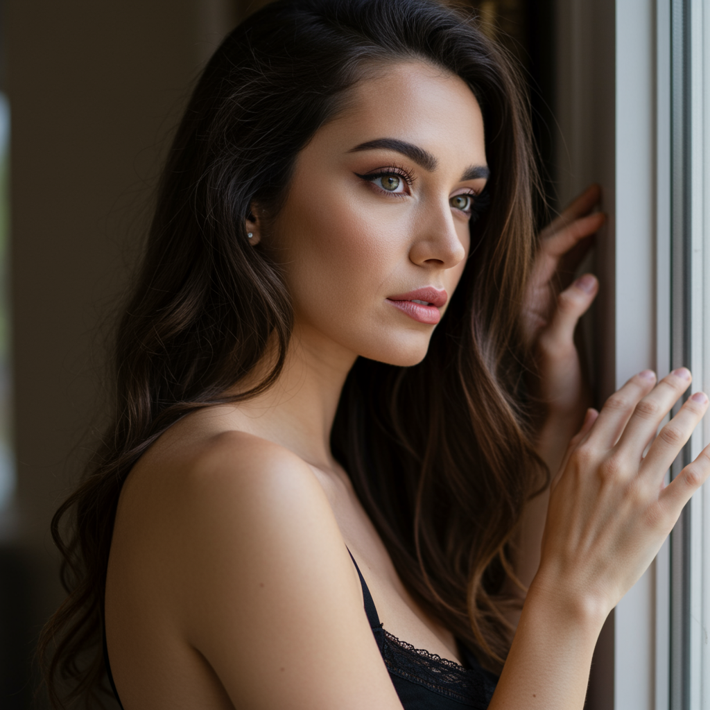 A RAW photograph captures a stunning woman posing by a window, showcasing her beauty in this portrait. Utilizing an 80mm lens at f22, the image trends on platforms like ArtStation and Pixiv due to its high detail, sharp focus, and aesthetic appeal. The 8k UHD quality, shot with a DSLR, highlights intricate details under soft lighting, resulting in a picture of exceptional quality. Emphasizing a close-up and cropped composition, the image intentionally avoids any low-quality elements or imperfections such as blurriness, jpeg artifacts, or anatomical errors. The focus remains solely on capturing the elegance and grace of the subject, free from any distortions or aberrations, presenting a single, true-to-life portrayal in the frame.