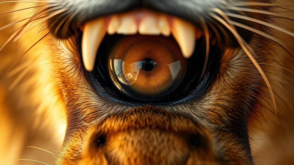 A razor-sharp hypermacro photography focus on the ridged pupil of a lion's gaze, with subtle golden iris striations and flecks of darker pigment scattered like constellations in a mesmerizing whirlpool, while the surrounding eyelids curl back in a fierce snarl, revealing sharp white teeth and raised whiskers, bathed in a dramatic, golden-brown lens flare that imbues the image with an otherworldly, feral intensity, pushing the boundaries of reality with an uncannily realistic texture and depth, as if the viewer can almost feel the heat emanating from the animal's pores, with subtle, skin-like imperfections and warping that belie the flawless, photo-realistic fidelity of the image, creating a 3d or 4d dimensional illusion on 2d, in a world of hyper-realistic fine details that outshines a high-quality photo with a megapixel count of 750, where the 5 view of a masterpiece is intensified with an extraordinary level of photorealism, creating an unprecedented degree of immersion that cannot be discerned by the naked eye, elevated into an unprecedented realm of hyper-dimension, 3-dimensional perspective.