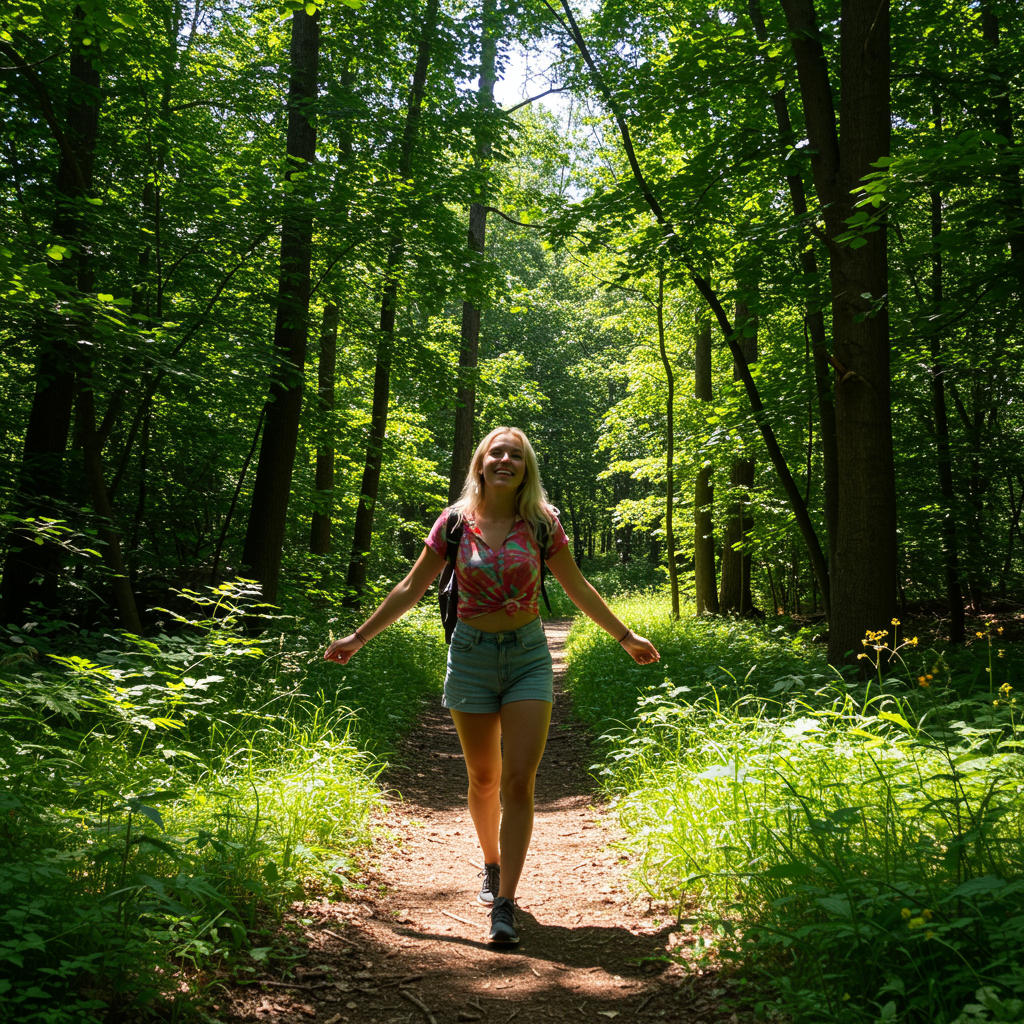 A real photo captures a blonde Instagram influencer exploring a sunlit forest trail on a warm day, surrounded by lush greenery and dappled light filtering through the leaves. Her vibrant outfit pops against the natural backdrop, her joyful expression and casual yet stylish pose conveying a sense of adventure and tranquility. The scene is vivid and immersive, drawing viewers into the serene beauty of the woods while highlighting her connection to nature and her inspirational lifestyle.