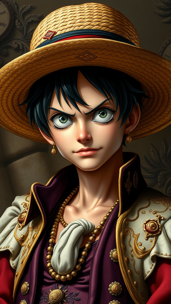 A realistic 4k portrait of Monkey D. Luffy in a baroque style, featuring intricate details and elaborate textures; Luffy is dressed in opulent baroque attire, adorned with detailed embroidery and rich fabrics; his signature straw hat is transformed with lavish embellishments and textures; the background showcases a dynamic interplay of light and shadow, reminiscent of classic baroque paintings; Luffy's expression is determined and adventurous, capturing his spirited personality amidst an air of grandeur and elegance.