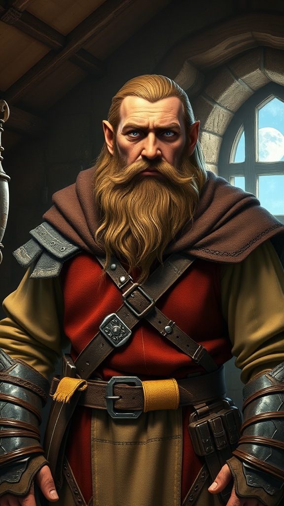 A realistic and colorful portrait of a male dwarf from Dungeons and Dragons, clad in leather and cloth armor, standing in a cozy stone cabin. His full beard and medieval attire reflect a fantasy ambiance, illuminated softly by moonlight streaming through a window, enhancing the RPG aesthetic. The detailed scene depicts him in a natural, knightly pose, with careful attention paid to anatomy and proportions to ensure an accurate representation. His eyes glimmer with determination, capturing the iconic fantasy RPG essence. The art mirrors classic design principles seen in works by Ralph Horsley and trending art on ArtStation. The environment encases him in a richly detailed and immersive 3D render, optimized with advanced rendering techniques such as ray tracing in Unreal Engine 5, ensuring vibrant global illumination and fine details without distortions or inaccuracies.