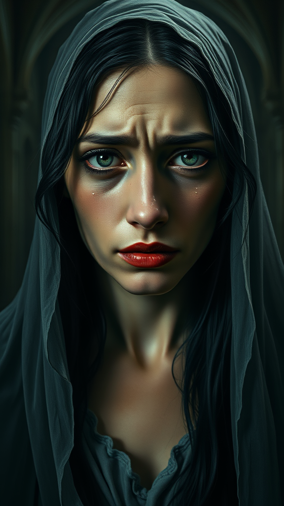 A realistic and epic portrayal of a woman in deep sorrow, her face expressing profound sadness with red and swollen eyes, furrowed brows, and a red nose. Her cheeks are wet with tears, and her half-open mouth conveys despair. She has black hair and beautifully detailed eyes that appear dark and soulful under dramatic, gothic lighting. This scene is captured in the painting style of French painter Alexandre Cabanel, with oil as the medium. The woman wears a veil and her neckline is elegantly draped, emphasizing the gothic art theme. She stands in an old gothic cathedral, surrounded by dim and gloomy lighting that enhances the melancholic atmosphere. The background and lighting contribute to the somber tone, while ensuring clarity and high resolution in the artwork. Negative elements like neon colors, 3D effects, cartoonish features, or poor anatomy are avoided to maintain the integrity of the piece.