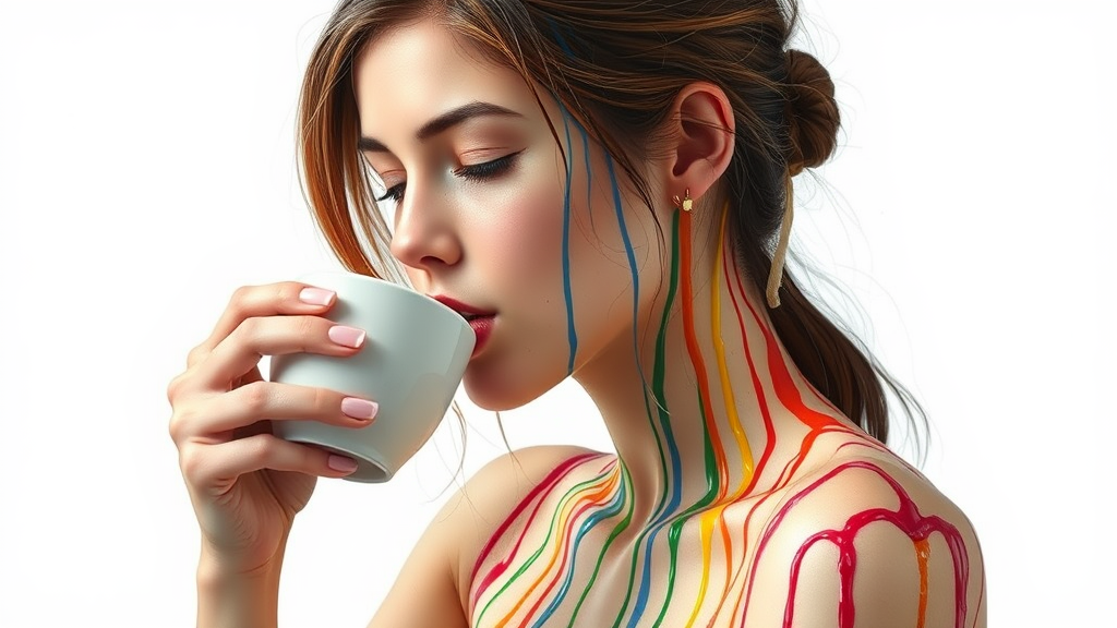 A realistic and high-detail depiction of a female figure adorned with an impactful composition of vibrant colors, as if dripping paint cascades gracefully across her form. She delicately sips a cup of coffee, her expression serene and contemplative. Set against a minimalist white background, the vivid hues of the paint contrast strikingly with the simplicity of the scene, capturing a moment of tranquil introspection.