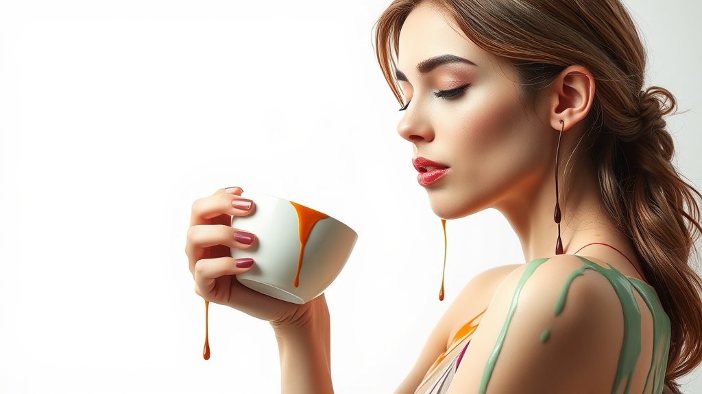 A realistic and highly detailed composition featuring a female figure with dripping paint flowing elegantly across her form, as she gracefully sips a steaming cup of coffee against a clean white background. The paint cascades in vibrant hues, creating a dynamic contrast with the serene expression on her face, capturing a moment of introspection and artistic flair.