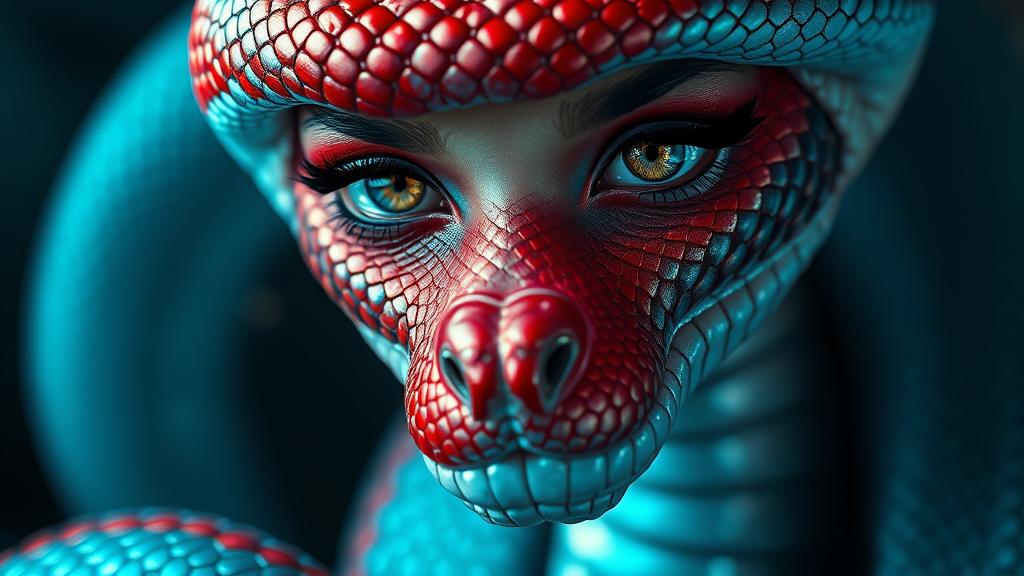 A realistic and photorealistic portrait of an anthropomorphic female snake adorned with stunning red, blue, and gold makeup. Set against a dark teal and white backdrop, capturing an aurorapunk aesthetic. The scene is stylized at a high level, with a vividness that enhances the enchanting visual experience, featuring subtle iridescent scales reflecting the backdrop's colors, adding a touch of mystical allure. Her eyes are expressive and captivating, with intricate patterns resembling delicate jewelry, accentuating her majestic presence amidst the striking contrast of colors.