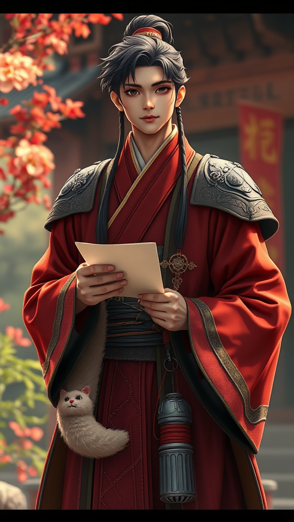 A realistic anime character with intricate costumes stands majestically in a vibrant setting, holding a paper in the guise of a gentle animal. The scene is inspired by the detailed artistry of Max Rive and Luke Fildes, infused with the bold creativity of TarΕ Okamoto. The character's attire, richly hued in reds and browns, blends seamlessly with the environment, capturing the essence of Cinestill 50D film. The hyper-realistic detail and raw style evoke a sense of lifelike animation, complemented by a composition that echoes a portrait orientation ratio.