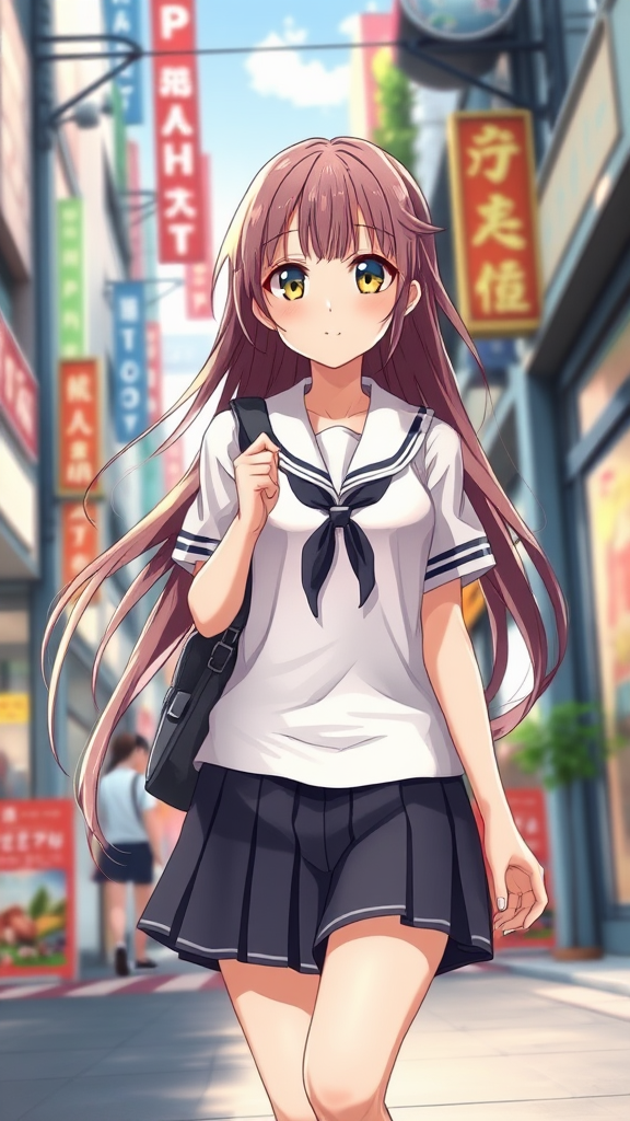 A realistic anime-style illustration depicts a cute high school girl walking down a bustling street in her school uniform. Her long hair flows gracefully, catching the light as she moves, with a vibrant urban background adding life to the scene. The girl has a radiant expression, exuding youthful energy and curiosity. The artwork reflects a smooth, detailed 3D anime style, reminiscent of a visual novel's key visual, capturing the essence of a charming, lifelike character within an anime world.
