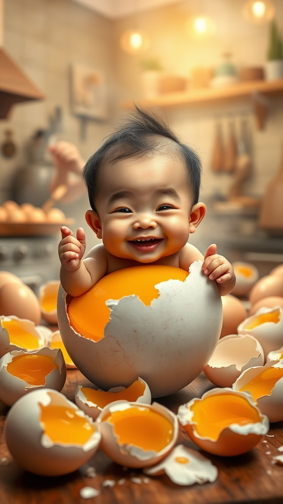 A realistic-caricature of a big-headed baby with an adult Indonesian man's face emerging joyfully from a newly cracked egg, grasping the jagged edges of the eggshell, surrounded by a rich golden yolk. Scattered around are several shattered eggs of the same size, adding a sense of playful chaos. In the background, a woman is diligently cooking in a bustling kitchen filled with warm light and aromatic steam. Ultra HD, 5k settings bring out the intricate details and vibrant colors of the scene, enhancing the whimsical yet lifelike nature of this imaginative portrayal.