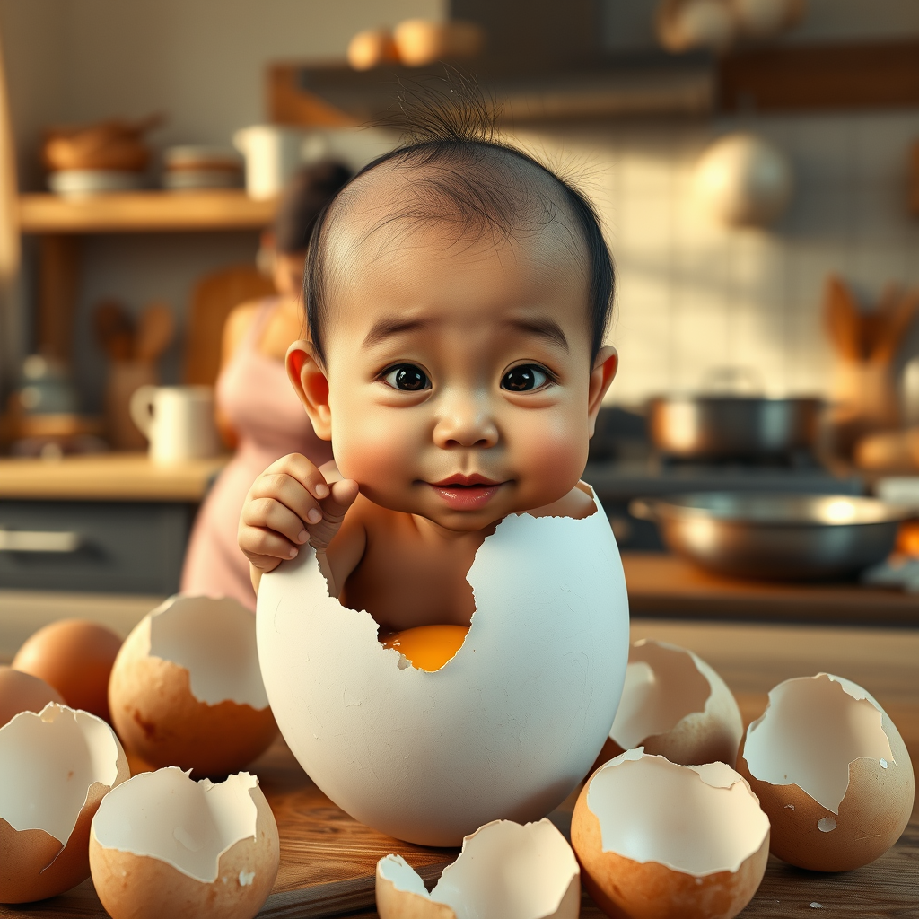 A realistic-caricature of a big-headed baby with the face of an Indonesian adult man, emerging from a newly hatched egg, clutching the rim with curious eyes. The yolk is visible inside the egg shell. In the background, several broken eggshells of similar size surround the scene in a bustling kitchen. A woman is cooking in the background, casting a warm, nurturing atmosphere. The setting is bathed in morning light, accentuating the textures and colors, captured in ultra HD, 5k resolution, with a touch of surreal whimsy.