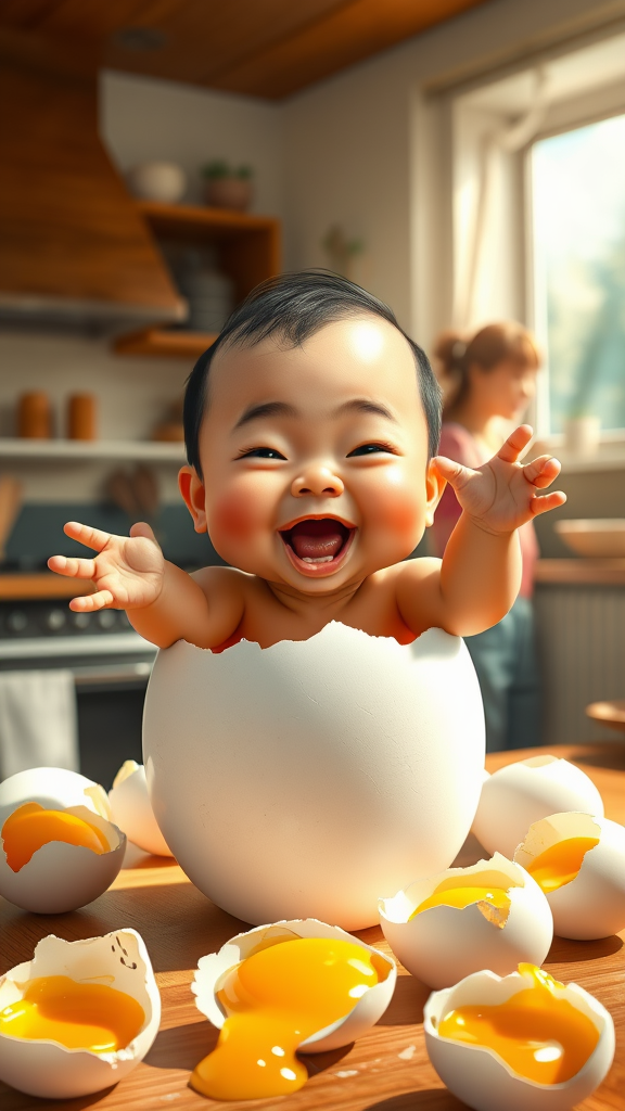 A realistic-caricature portrait of a big-headed baby with the face of an Indonesian adult man emerging joyfully from a freshly cracked egg, grasping the rim with expressive hands, yolk gleaming around him. The setting is a vibrant kitchen with several broken eggs of the same giant size scattered around, and a woman in the background cheerfully cooking at the stove. The atmosphere is warm and bustling, with sun rays streaming through a window, illuminating the scene in ultra HD, 5k resolution.