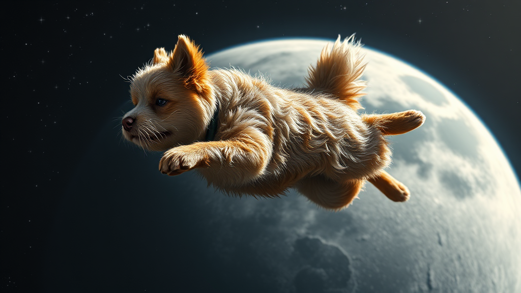 A realistic depiction of a furry dog soaring gracefully through the vastness of space, with the moon's surface visible in the background, captured in stunning 4k detail.