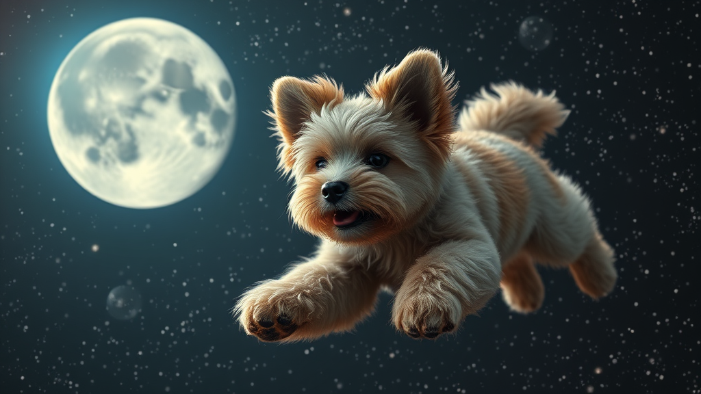 A realistic depiction of a furry dog soaring through the cosmos, set against the backdrop of the moon and glittering stars, captured in stunning 4k detail.