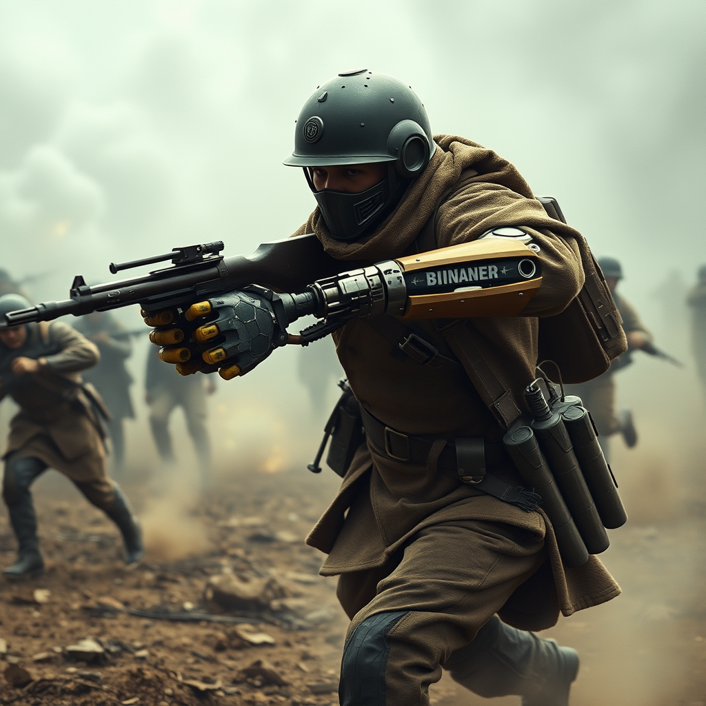 A realistic depiction of a World War I cyborg soldier, featuring one robotic hand and a futuristic weapon, charging aggressively towards the enemy in an intense battlefield setting. Fellow soldiers can be seen attacking in the background amidst swirling smoke and foggy weather, creating an atmosphere reminiscent of the early 20th century. The image is captured in the style of a 19th-century photograph, complete with the grainy, noisy quality characteristic of that era. The cyborg soldier's robotic hand and fingers are meticulously detailed, while their realistic skin and clothing display intricate fabric textures, blending high-tech elements with the classic World War I aesthetic.