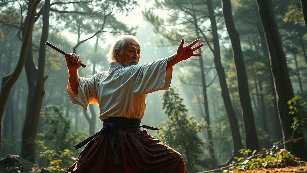 A realistic depiction of an elderly Japanese man gracefully practicing martial arts amidst a stunning forest setting, captured with intricate detail and a keen eye for the rule of thirds and golden ratio. The scene is reminiscent of a cinematic masterpiece, blending the classical oil painting techniques of Da Vinci with the dramatic lighting style of Greg Rutowski. The artwork showcases the contrast between the serene natural backdrop and the dynamic movements of the martial artist, infusing a sense of timeless elegance and strength. Despite subtle artistic liberties, the essence of tradition and discipline is maintained, creating a compelling and evocative visual narrative.