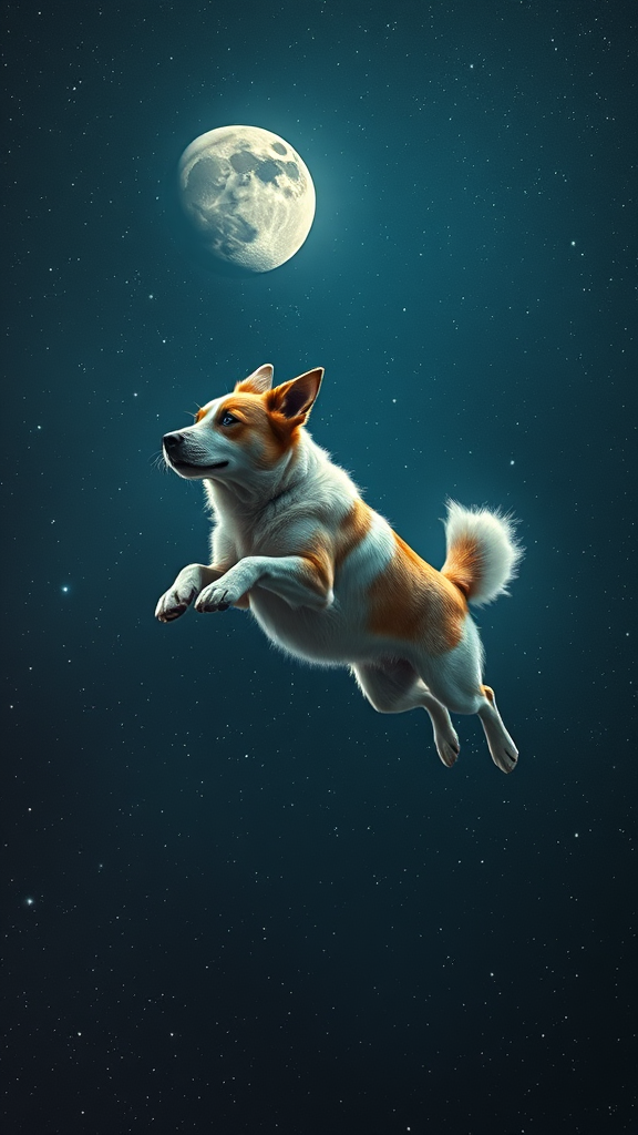 a realistic dog soaring through the cosmos, gliding gracefully past the moon in the vast expanse of space, its fur shimmering under the celestial lights with stunning 4k clarity