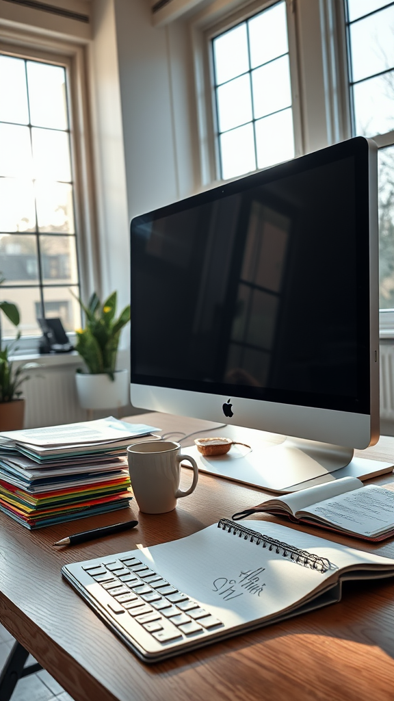 A realistic, dramatic image of an iMac Pro and a Dell UltraSharp monitor sitting on a wooden desk in a sunlit office. The morning light streams through large windows, casting soft shadows. The desk is cluttered with stacks of colorful papers, a half-filled coffee mug, and a small potted plant. A sleek wireless keyboard and an open notebook with scribbles are slightly askew. The wide-angle lens captures the expansive feel of the space, highlighting the modern yet lived-in atmosphere.