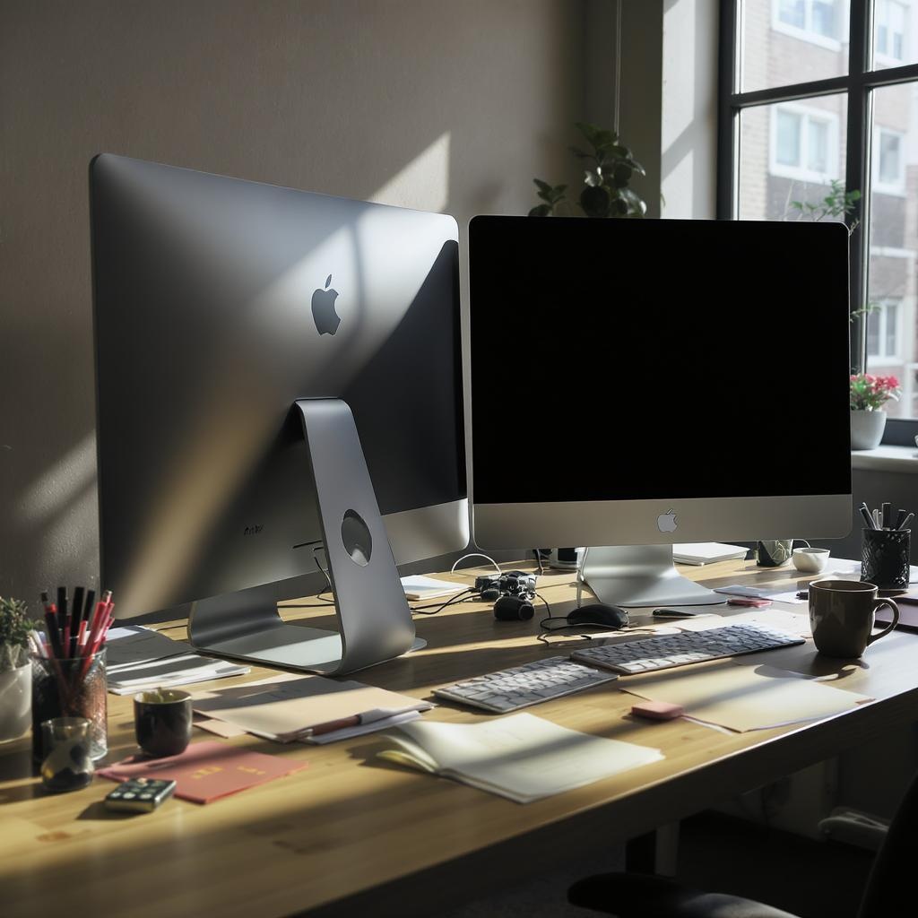 A realistic, dramatic image of two computer monitors, one iMac Pro with its sleek silver finish and another larger monitor with a matte black frame, positioned side by side on a modern wooden desk in a sunlit office. The desk is strewn with an eclectic assortment of papers, pens, and a few personal trinkets like a small potted succulent and a vintage camera. A ceramic coffee mug sits precariously near the edge. The wide-angle perspective emphasizes the spaciousness of the room and the gentle play of natural light filtering through large windows, casting soft shadows and highlights on the cluttered yet organized chaos.