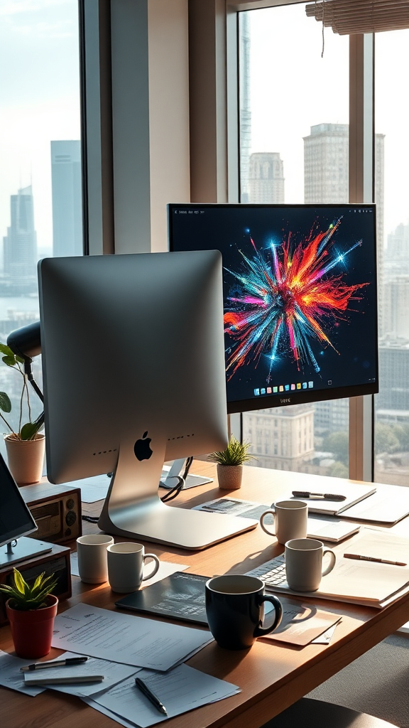 A realistic, dramatic image of two computer monitors, an iMac Pro and a curved ultrawide monitor, sitting on a desk in a sunlit office. The desk is cluttered with papers, coffee mugs, a potted plant, and a vintage radio. The scene is captured with a wide-angle lens, enhancing the sense of space and scale. In the background, large windows reveal a cityscape with towering skyscrapers, adding depth and context to the setting. The iMac glows softly while the ultrawide displays a dynamic digital artwork, creating a contrast between functionality and creativity, embodying the essence of a modern workspace.