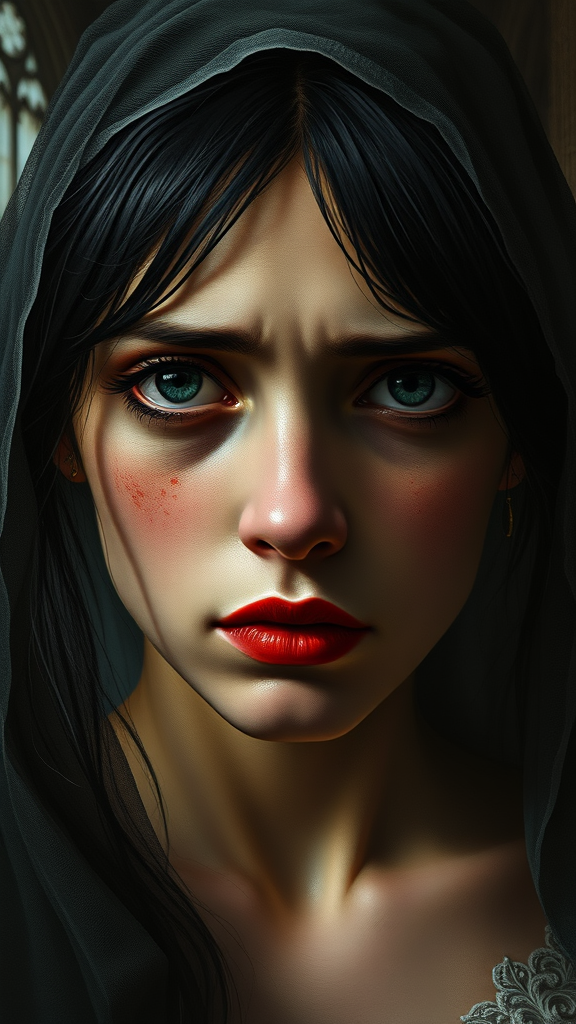 A realistic epic painting of a woman with a deeply sorrowful expression, her red and swollen eyes reflecting profound sadness. Her furrowed brows and red nose contrast with her wet cheeks and half-open mouth, while her black hair frames her face. Her beautifully detailed eyes and ears reflect the intricate style of French painter Alexandre Cabanel. The scene is illuminated with dramatic, gothic lighting, resembling an old cathedral's dim and somber ambiance. She wears a delicate veil and a modest neckline that enhances the gothic aesthetic. The background, a shadowy Gothic cathedral, adds to the overall gloomy atmosphere. The painting is evocative of Cabanel's oil masterpieces, emphasizing emotion with a touch of old-world elegance. Avoid elements like neon colors, 3D effects, cartoonish or anime styles, sketches, low resolution, or poor anatomy. The focus remains on capturing the delicate balance of beauty and despair, avoiding exaggerated features or deformed depictions.