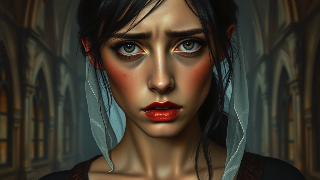A realistic epic painting of a woman with black hair, featuring a deeply sad facial expression, red and swollen eyes, and furrowed eyebrows. Her red nose and wet cheeks accentuate her melancholy. Her mouth is half-open, revealing her distress. She has beautifully detailed eyes and ears, set in a dramatic and moody lighting akin to Gothic art. The piece is reminiscent of the style of French painter Alexandre Cabanel, executed in oil. She wears a delicate veil and her clothing reveals a modest neckline. The background is an old Gothic cathedral with dim, gloomy lighting that enhances the somber mood. Negative prompt: avoid elements like neon colors, 3D effects, cartoon, anime, or sketch styles, as well as low resolution qualities. Steer clear of details like acne, poor anatomy, exaggerated features, or any deformation.