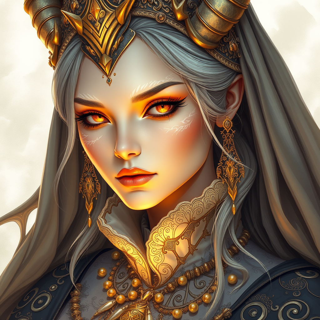 A realistic hyper-detailed portrait of a woman in demonic attire, her face intricately adorned with light gray and light gold hues. The illustration is vibrant, capturing a regal essence with a queencore influence. Her features are highlighted with shades of white and amber, enveloping her in an ethereal glow, while her attire is masterfully sculpted, blending elegance with a touch of otherworldly power. The atmosphere conveys a lifelike presence with an air of mystique and authority.