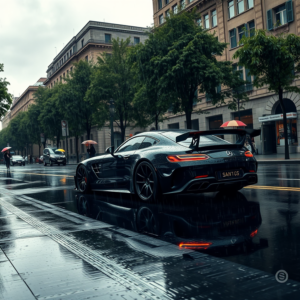 A realistic illustration of a Black Mercedes Benz AMG GTR cruising through the drenched streets of Berlin, Germany. It's noon, and the cityscape is under a moody, overcast sky with raindrops cascading down in a gentle pattern, reflecting the intricate details of the architecture in a shimmering dance on the wet road. The car's sleek bodywork glistens under the muted, diffused light, revealing the exquisite craftsmanship of its design. Lush green trees lining the boulevard sway softly in the rain. Passersby, shielded under vibrant umbrellas, add a splash of color to the otherwise monochrome scene. The image captures an 8K resolution with HDR quality, using Octane Render for a hyper-realistic finish, with an aspect ratio of 16:16.