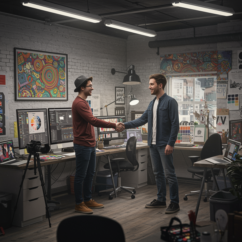 A realistic image of a delighted customer exchanging a handshake with a Graphic Designer in a bustling Design Studio, filled with state-of-the-art computers, sleek laptops, and high-end cameras. The walls are adorned with an art prize winner masterpiece, showcasing vibrant colors and intricate details. The atmosphere is energetic and inspiring, reflecting the innovation and creativity that permeates the space. The Graphic Designer, dressed in trendy casual attire, exudes confidence and professionalism, while the customer displays genuine satisfaction and appreciation. The studio's modern decor and large windows invite natural light, highlighting the artistic achievements and creative spirit within.