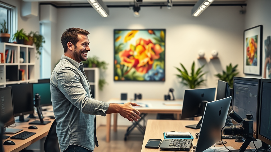 A realistic image of a delighted customer shaking hands with a Graphic Designer in a vibrant Design Studio filled with cutting-edge computers, sleek laptops, and high-quality cameras. The walls are adorned with an art prize-winning masterpiece, showcasing the creative achievements of the studio. The atmosphere is one of innovation and collaboration, reflecting the dedication to artistic excellence.