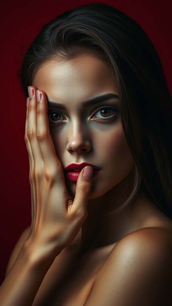 A realistic image of a woman showcasing a contemplative expression, her hand elegantly covering half of her face, set against a deep crimson background that accentuates her facial intricacies, creating an enigmatic atmosphere, ultra-high definition, intricate details, tall aspect ratio.