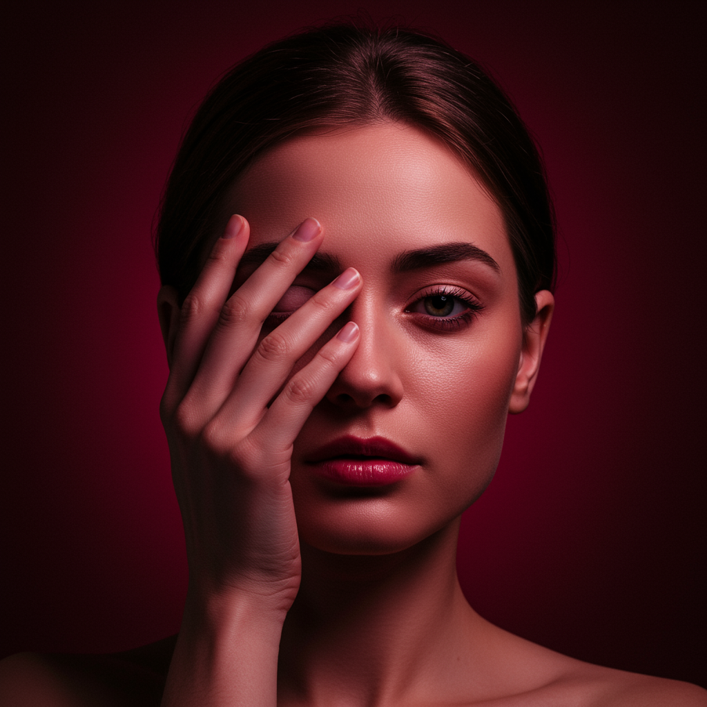 A realistic image of a woman with a contemplative expression, softly covering one eye with her hand, set against a deep crimson background that accentuates the intricate details of her face and amplifies a sense of enigma, ultra-high definition, capturing the nuances of her skin and emotion, with subtle highlights adding depth and allure.