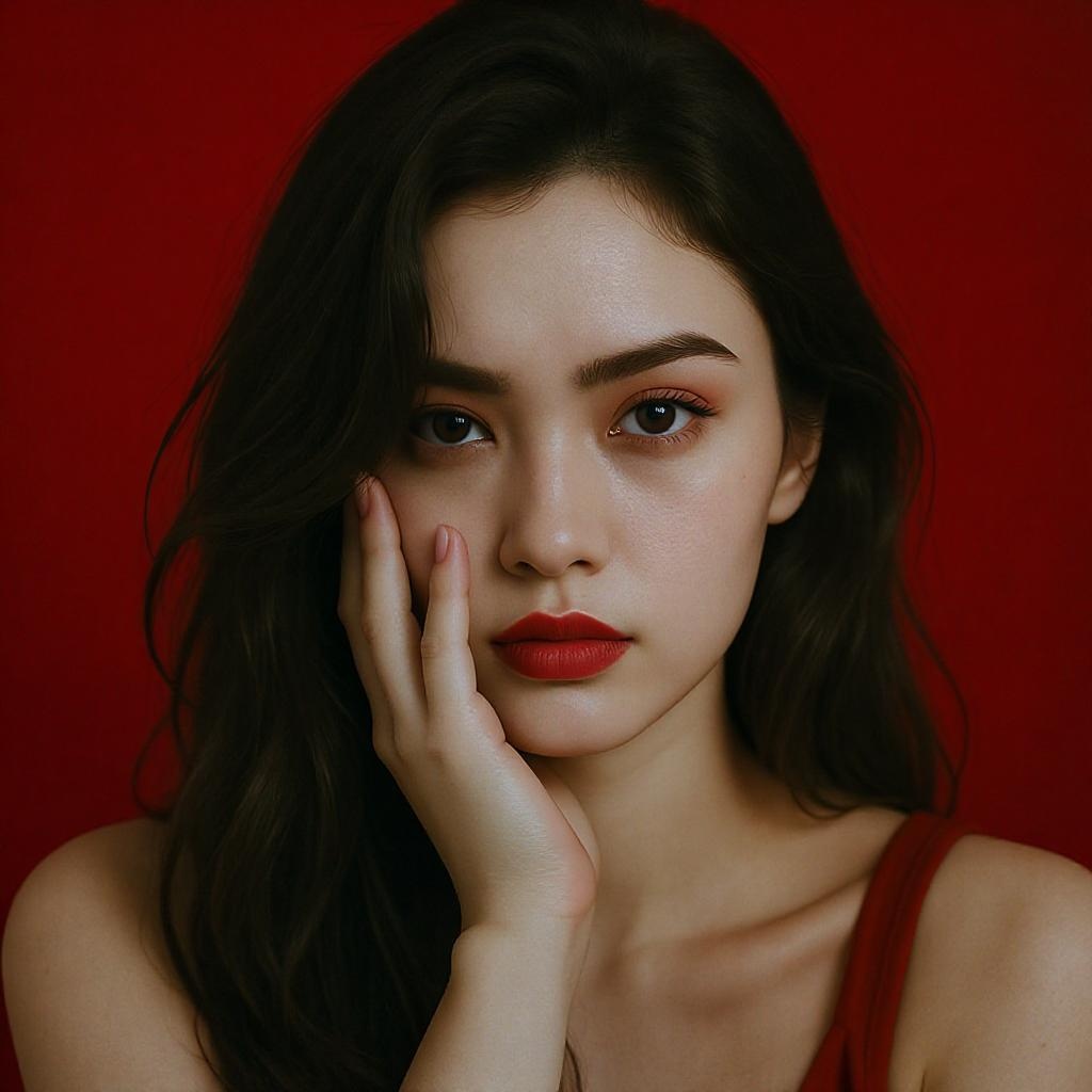 A realistic image of a woman with an introspective expression, her fingers gently resting on her cheek, concealing a part of her face, set against an intense crimson backdrop to accentuate her facial features and evoke intrigue, with exceptional clarity and intricate detail, in a vertical aspect.