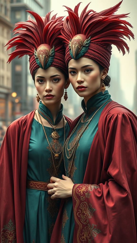 A realistic image of two people, exuding the charm of avian royalty in a neo-renaissance style, adorned in elegant maroon and emerald robes and intricate cloth hats reminiscent of feathers. Their features blend human and bird-like qualities, embodying graceful speculation. The setting is a bustling cityscape with an ethereal atmospheric quality, framed in the unique proportions of 50:49. Their expressions reveal a harmonious connection, as if they share a secret, enriching the city portrait with an aura of mystique.