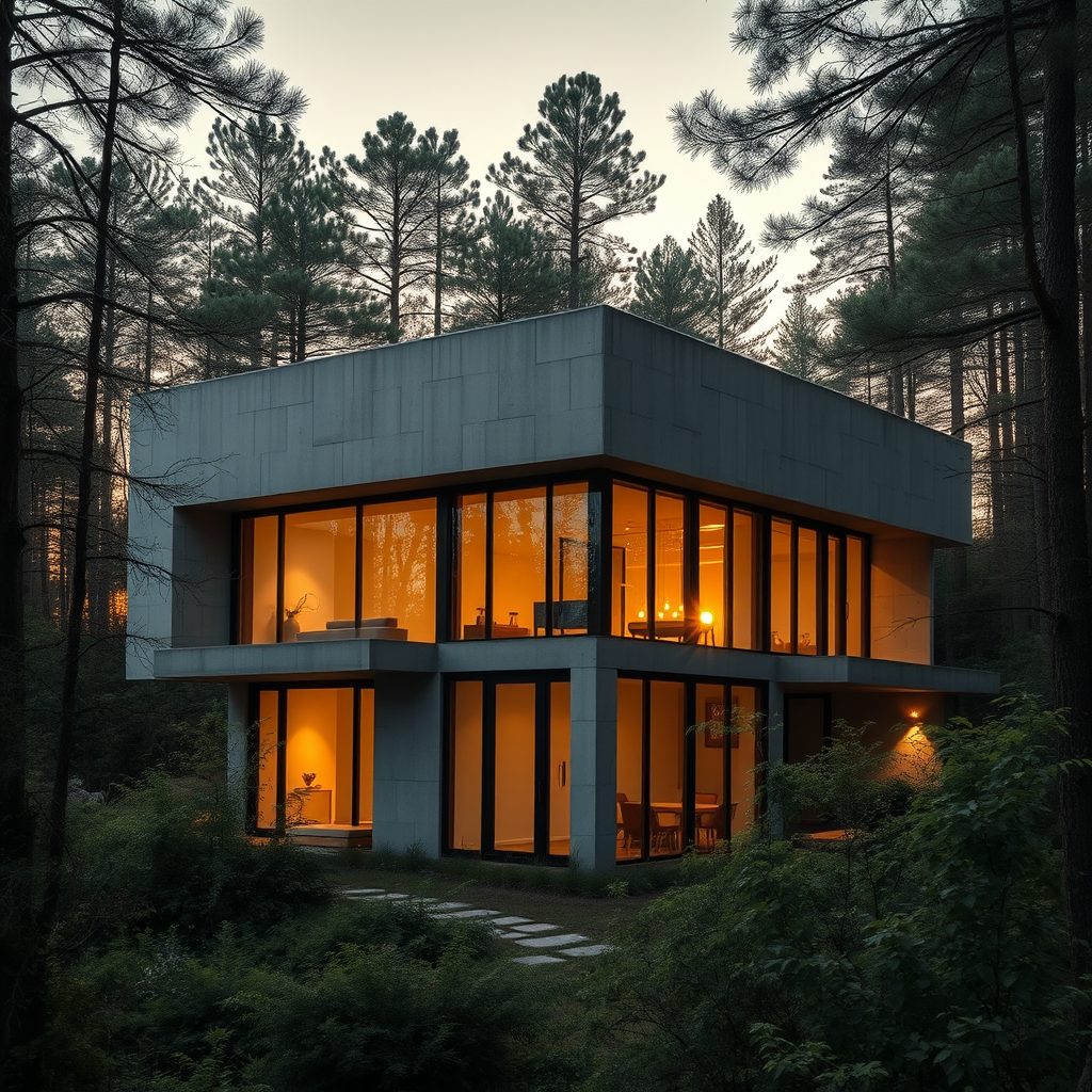 A realistic photo depicts a modern house nestled in a dense forest at dusk, showcasing a unique blend of brutalist architecture and extensive glass walls. The structure features bold geometric shapes with rough, raw concrete surfaces, contrasted by large, translucent glass panels that dominate the exterior. As the sun sets, a warm, golden glow filters through the forest canopy, casting soft shadows and enhancing the distinct lines of the house. The combination of stark architectural design with the organic, lush surroundings creates a harmonious yet striking visual, where the imposing, man-made elements seamlessly integrate with nature.