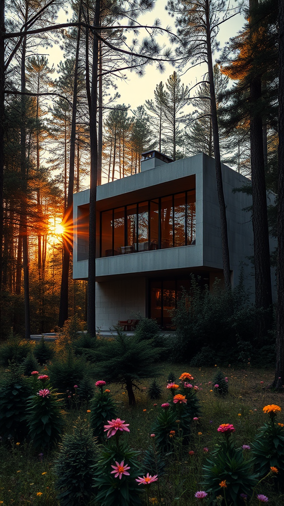 A realistic photo depicts a striking brutalist-style house nestled within a dense forest during sunset. The structure showcases its characteristic raw concrete facade, defined by bold geometric shapes and extensive glass walls, allowing the beauty of the natural surroundings to be seen from within. As the sun descends, a golden hue bathes the scene, enhancing the dramatic contrast between the stark architecture and the forest's organic forms. The interplay of light and shadow accentuates the intricate design details, while lush foliage surrounds the house, creating a harmonious balance between the man-made and natural worlds. Colorful wildflowers dot the forest floor, adding unexpected bursts of color to the landscape.