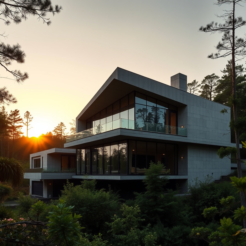 A realistic photo of a brutalist-style house, featuring walls made predominantly of large glass panels. The house is situated in the heart of a dense forest during a serene sunset. The architectural design showcases the characteristic raw concrete and bold geometric shapes of brutalism, modified by an innovative triangular rooftop. The setting sun casts a gentle, golden hue over the scene, accentuating the house's dramatic design while it harmonizes with the lush greenery of the forest. The image captures a dynamic interplay between the sharp, solid lines of the structure and the natural, flowing elements of its surroundings.