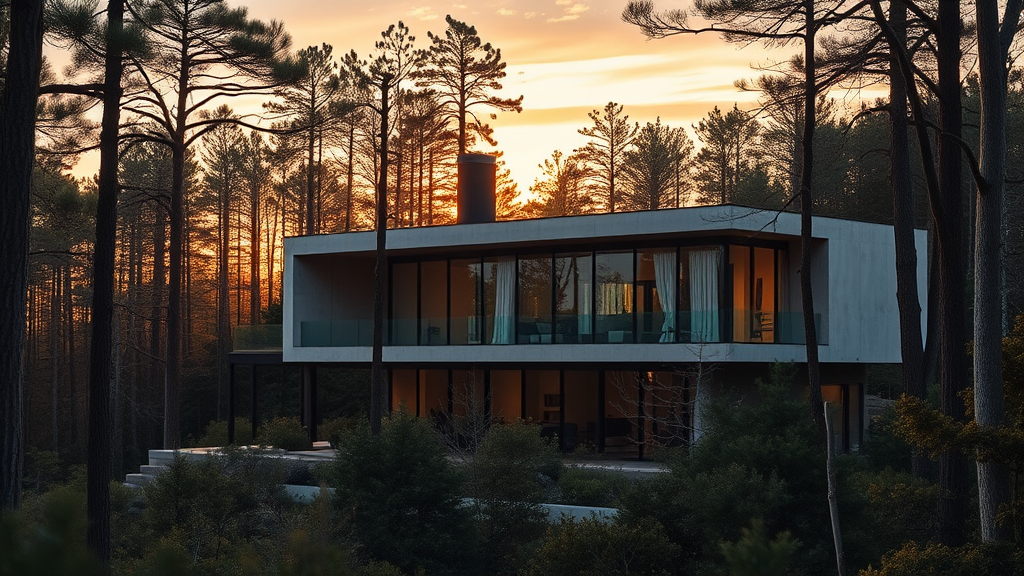 A realistic photo of a brutalist-style house nestled deep within a forest during the golden hour of sunset. The structure features extensive floor-to-ceiling windows that allow natural light to flood the interiors, with sections of raw concrete adding to its geometric allure. The house's bold angular shapes and clean lines stand in striking contrast to the surrounding trees and foliage, creating a harmonious blend of man-made and natural elements. As the sun sets, a warm glow envelops the scene, accentuating the juxtaposition of the house's rugged exterior with the forest's organic beauty. The glass surfaces reflect the fiery hues of the sky, enhancing the dynamic interplay between the artificial and the natural environment.
