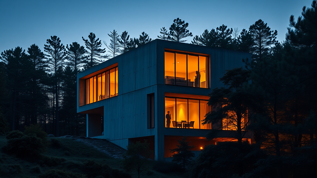 A realistic photo of a brutalist-style house set in the heart of a dense forest at twilight. The structure boasts predominantly glass walls, allowing the warm hues of the setting sun to flood in and reveal the intricate interplay of light and shadow against the raw concrete and angular geometry characteristic of brutalism. The house’s bold, rigid lines stand in stark contrast to the lush, organic shapes of the surrounding trees, while the fading sunlight casts an ethereal glow, accentuating the surprising harmony between the stark architecture and the vibrant natural environment.