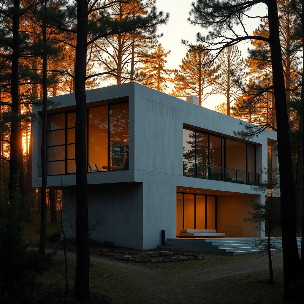 A realistic photo of a brutalist-style house, where the structure is predominantly composed of expansive glass walls interspersed with raw concrete. This architectural marvel, featuring bold geometric forms and a minimalist design, is set within a dense forest. The setting sun bathes the scene in a golden light, accentuating the juxtaposition between the house's striking, angular lines and the soft, irregular contours of the surrounding trees. The warm glow enhances the contrast between the cool concrete and the inviting warmth of the glass, creating a harmonious blend of human ingenuity and natural beauty.