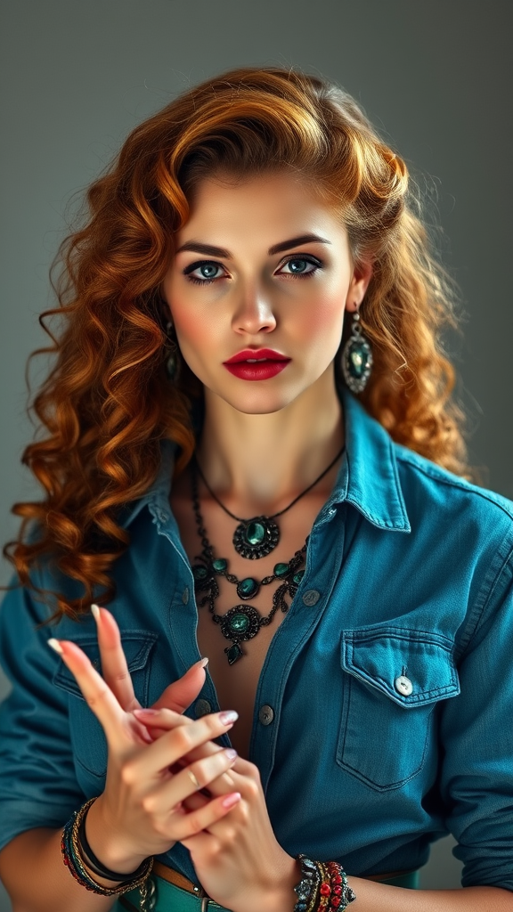 A realistic photo of a woman dressed as Mera, capturing her vibrant costume in 8k resolution, adorned with gothic jewelry including a necklace, earrings, and bangles. Her curly hair catches the light, casting playful shadows against her shoulders. The denim shirt adds a casual twist to her regal appearance. The background softly blurs into a gradient, enhancing the focus on her intricate costume details. Despite the clarity of the costume, subtle touches of surrealism blend in, like elongated limbs and fingers that almost dance in the air, invoking a sense of fantastical charm. The colors remain vivid, but with an intentionally dreamlike haze that softens the overall composition. There are hints of imperfect anatomy, adding an abstract element to the image, while ensuring her expression remains captivating, with slightly exaggerated features that evoke mystery and allure.