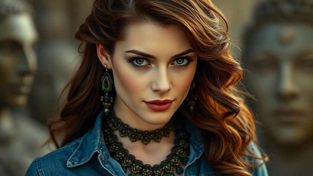 A realistic photo of a woman resembling Amber Heard dressed as Mera, captured in high resolution. She wears an elaborate, gothic-inspired necklace and earrings. Her hair is styled in soft curls with prominent shadows adding depth. The character is depicted with a denim shirt adding a unique twist to the classic Mera attire. The image background is softly blurred, enhancing focus on the figure while maintaining a sense of depth. Her expression is neutral, and her appearance is meticulously detailed, with a natural skin texture and lifelike features. The overall composition maintains visual harmony, emphasizing realism and clarity.