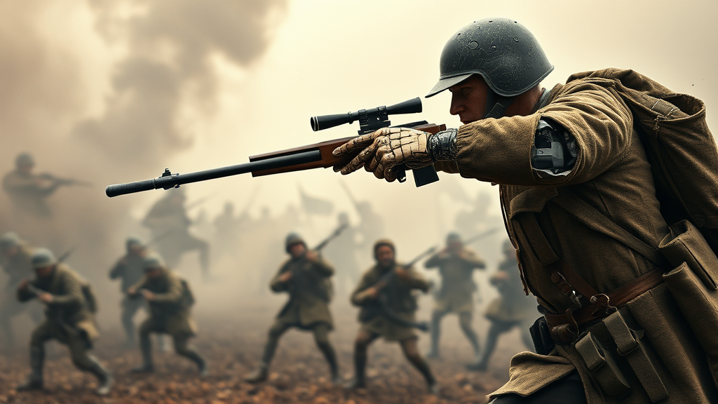 A realistic photo of a World War One cyborg soldier with one robotic hand wielding a futuristic gun, charging aggressively toward the enemy on a chaotic battlefield. In the background, soldiers are attacking amidst smoke-filled air and foggy weather, capturing a historic 19th-century photo style. The image is reminiscent of an early 20th-century photograph with intentional noise and high quality, merging high-tech elements with WW1 aesthetics. The cyborg soldier has a well-crafted robotic hand with articulated fingers, realistic skin, and intricately detailed and textured fabric on their uniform, showcasing a blend of past and future war elements in high resolution.