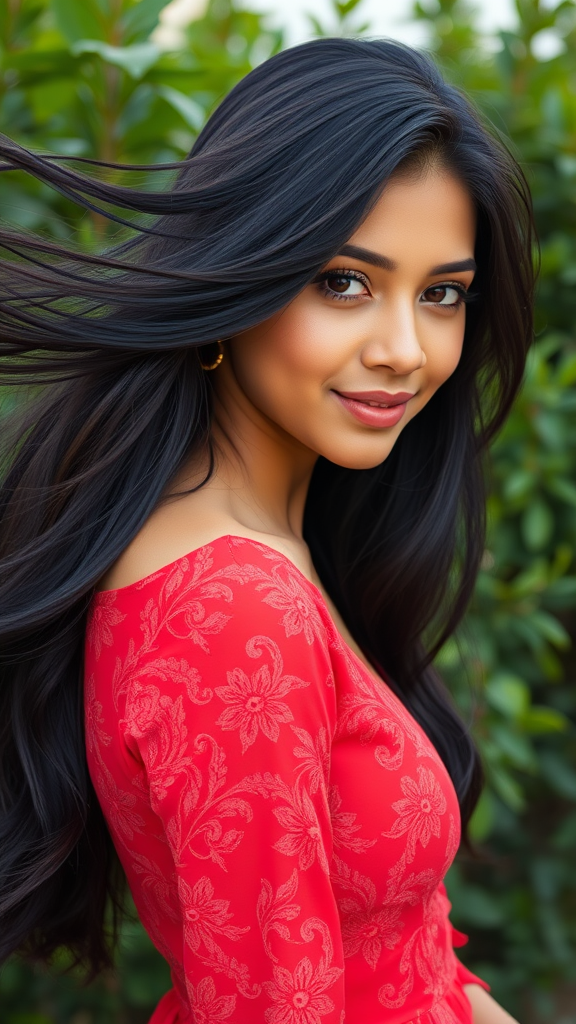 A realistic photo of a young woman with flowing black hair, looks like she's in her mid-20s and has deep, expressive brown eyes, wearing a vibrant red dress with intricate floral patterns, light makeup with a hint of rose on her cheeks, looking confidently at the camera with a gentle smile, glowing olive skin against a backdrop of lush greenery, capturing a moment of serene elegance in an early morning light atmosphere.