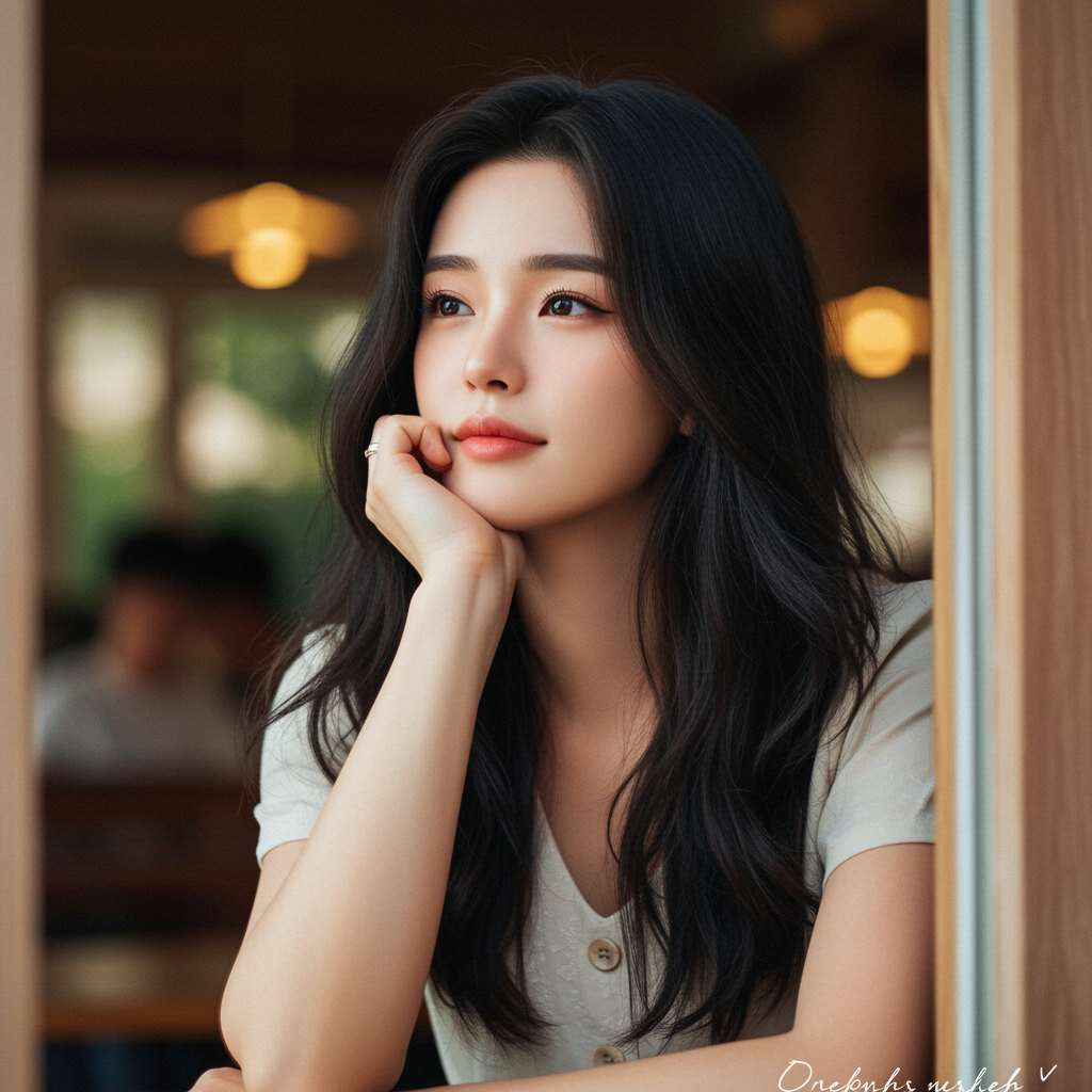 A realistic photo of a young woman with flowing black hair, looks like she's in her late twenties, and has deep brown eyes, wearing a casual white dress with light makeup, looking thoughtfully out of a café window, skin glowing softly in the natural light with a serene expression --ar 9:16 --stylize 750 --v 6