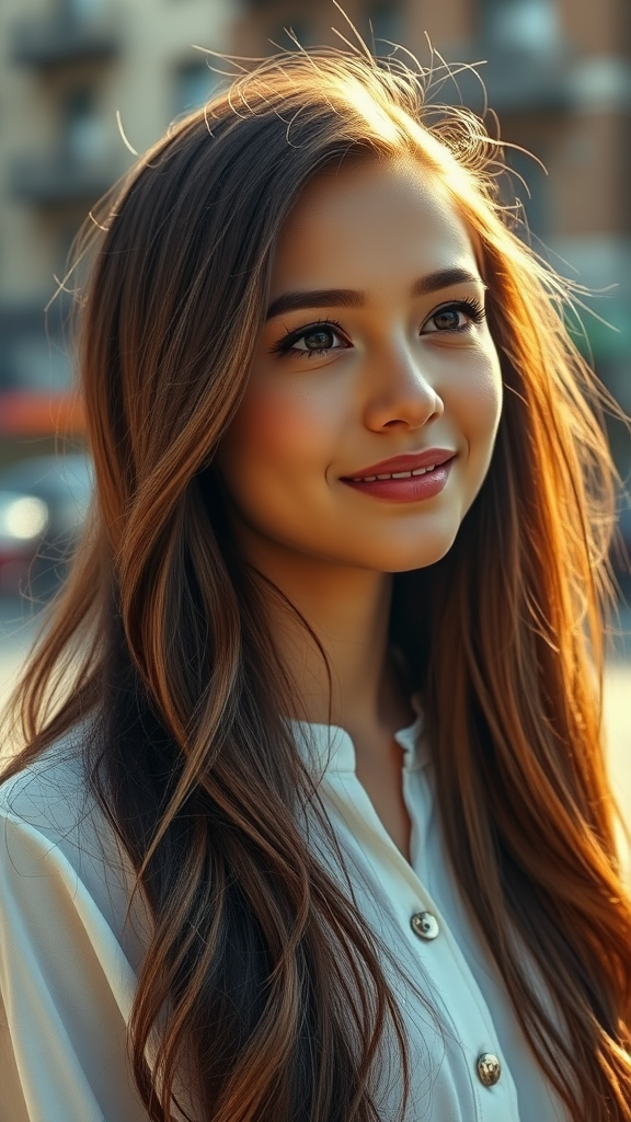 A realistic photo of a young woman with long flowing brown hair, bright hazel eyes, and a gentle smile, wearing a casual white blouse and light makeup, looking thoughtfully into the distance, sun-kissed skin illuminated by the soft glow of a late afternoon sun, against a blurred urban backdrop.