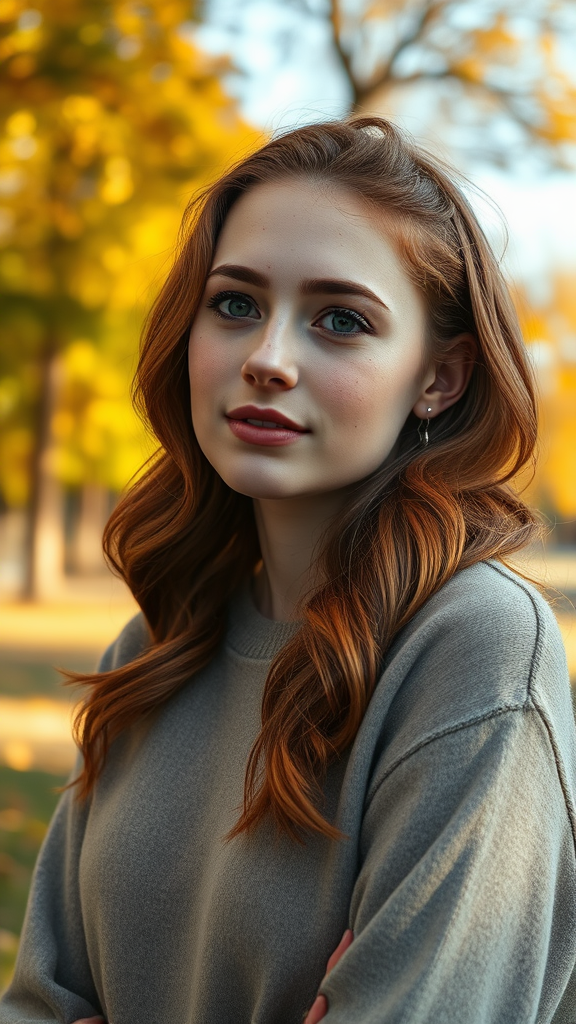 A realistic photo of a young woman with wavy auburn hair, delicate freckles, looks kind and approachable, wearing a soft cashmere sweater, light makeup with a hint of blush, looking wistfully into the distance, porcelain skin with a natural glow, a serene park background with golden autumn leaves, capturing the late afternoon sunlight that casts a warm glow --ar 9:16 --stylize 750 --v 6.