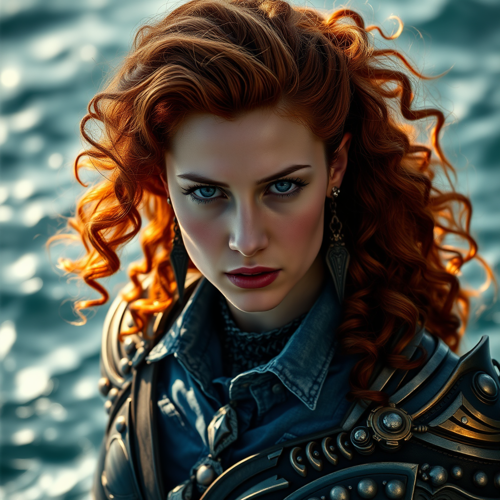 A realistic photo of Amber Heard as Mera, with an 8k resolution, featuring intricate jewelry including a gothic necklace and earrings. She is depicted with a denim shirt under her armor, her curly red hair cascading with shadows adding depth. The image captures a sense of fierce elegance, her expression confident and intense. Surrounding her is an ocean-inspired background, slightly blurred to highlight her presence. Her portrayal as Mera is vivid and strong, embodying the essence of the character while subtly integrating casual elements like the denim shirt, enhancing the modern and grounded vibe of this depiction.