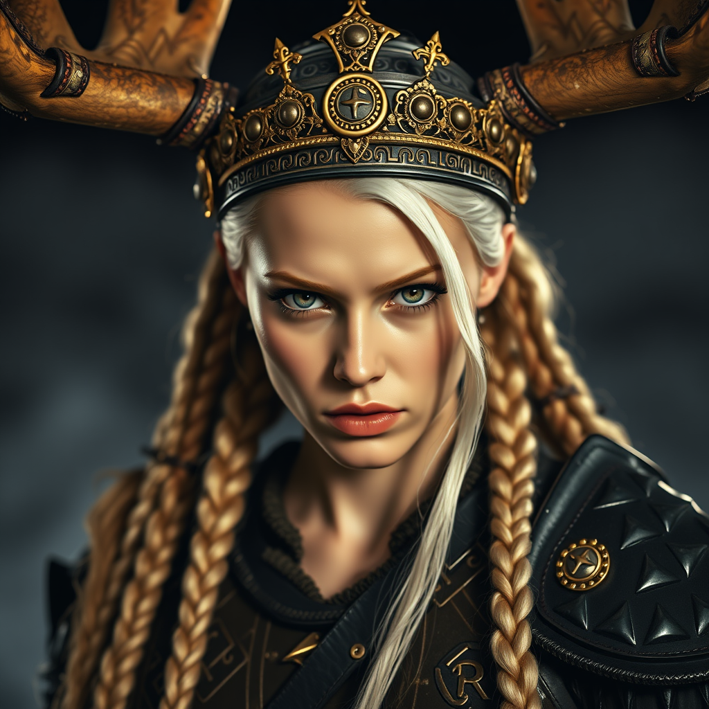 A realistic photograph of a fierce Viking warrior princess in elaborate dark armor, adorned with a majestic and detailed moose crown and a luxurious golden tiara. Her attire combines tribal and barbarian elements with a touch of high fashion. The armor is decorated with symbolic engravings, and her face is beautifully symmetrical with striking braided platinum blonde hair. She has piercing, realistic eyes and a pale complexion that glows under the warm night light. The warrior princess gazes confidently into the camera with an arrogant expression, capturing the essence of strength and beauty. Set outdoors at night, this medium close-up is taken with a Canon 5d using a 100mm lens, showcasing hyper realism and intricate detail in award-winning photography. The hard rim lighting accentuates her regal presence, creating a captivating and detailed portrait.