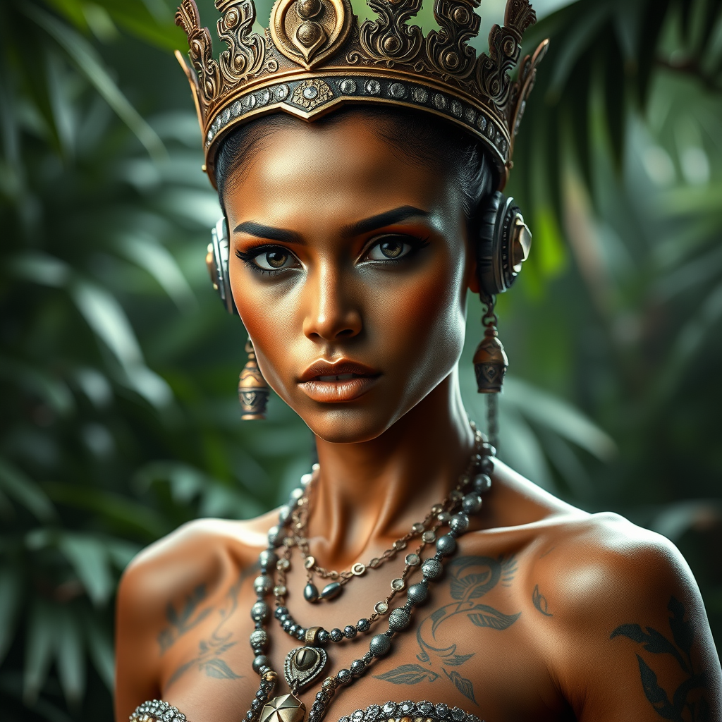 A realistic photograph of a three-quarter full-body portrait depicting a warrior queen, featuring intricate and highly detailed robotic parts. She wears a crown and has intense, piercing eyes. Her appearance is complemented by elegant jewelry and tribal tattoos. Set against a lush jungle background, the image is in sharp focus with soft lighting that accentuates skin texture, pores, and a beauty spot. Realistic reflections highlight her extremely detailed skin. Captured with an 80mm lens at f1.2, the composition resembles a National Geographic portrayal. Though she has a slightly elongated neck, the depiction maintains balanced proportions, portraying her robust and confident presence. The image avoids oversaturation, with a balanced color palette and subtle shadows. Spotlights softly illuminate the scene, creating depth. Her distinctive appearance is further accentuated by a unique scar, adding character. The focus is on artistic quality, sidestepping poorly drawn elements and ensuring all physical features are clearly and expertly rendered.