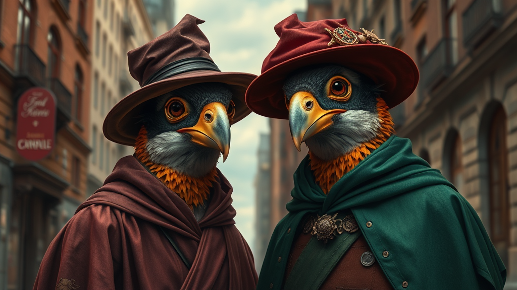 A realistic portrait featuring two individuals adorned in cloth hats and robes, capturing the essence of avian-themed characters with an air of neo-renaissance charm. The scene is set amidst a city backdrop, incorporating a rich palette of maroon and emerald hues. The characters are depicted with lifelike detail, reminiscent of classical animal portraits, exuding a sense of elegance and whimsy. The composition harmonizes the traditional with the fantastical, presenting a unique blend of style elements inspired by nature and urban sophistication.