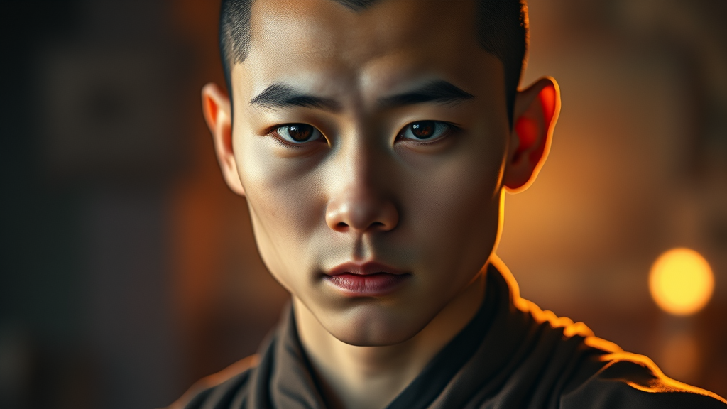 A realistic portrait of a beautiful young zen monk with serene expression, surrounded by a gentle warm glow, cinematic lighting highlighting delicate features, captured in 8k resolution, shot on 35mm lens at f1.4 using Fujifilm color film, gentle background blur, slight creative adjustments to emphasize tranquility and harmony, evoking deep peaceful vibes.